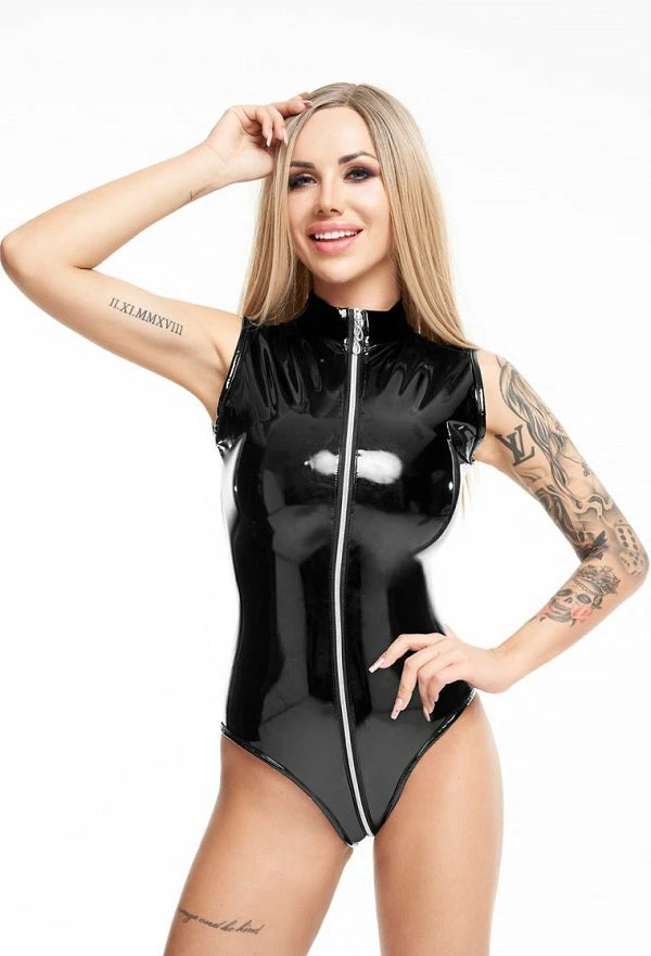 Stretch vinyl body with three-way zip. This body is also available in red.