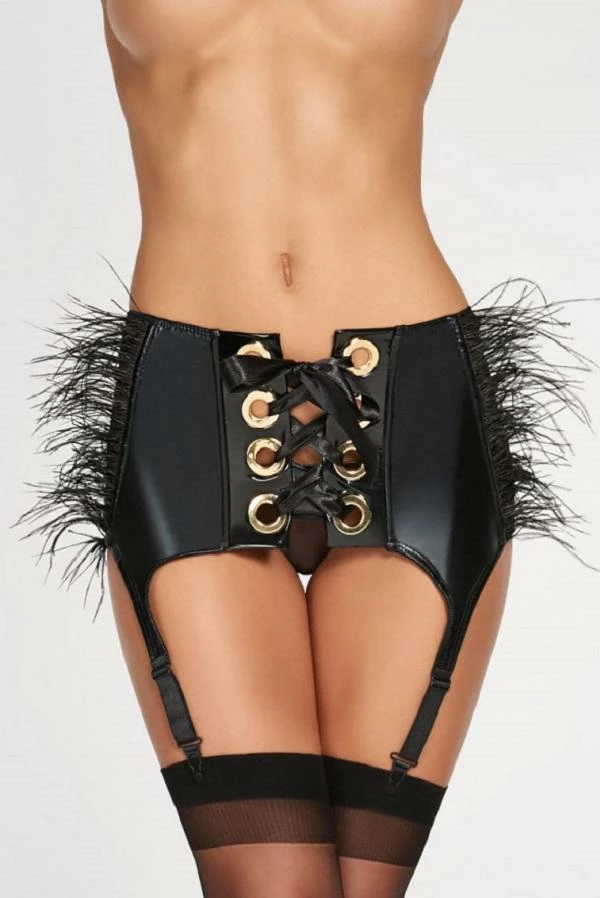 Sexy garter belt with feathers and lacing. Stockings included. Made in EU.