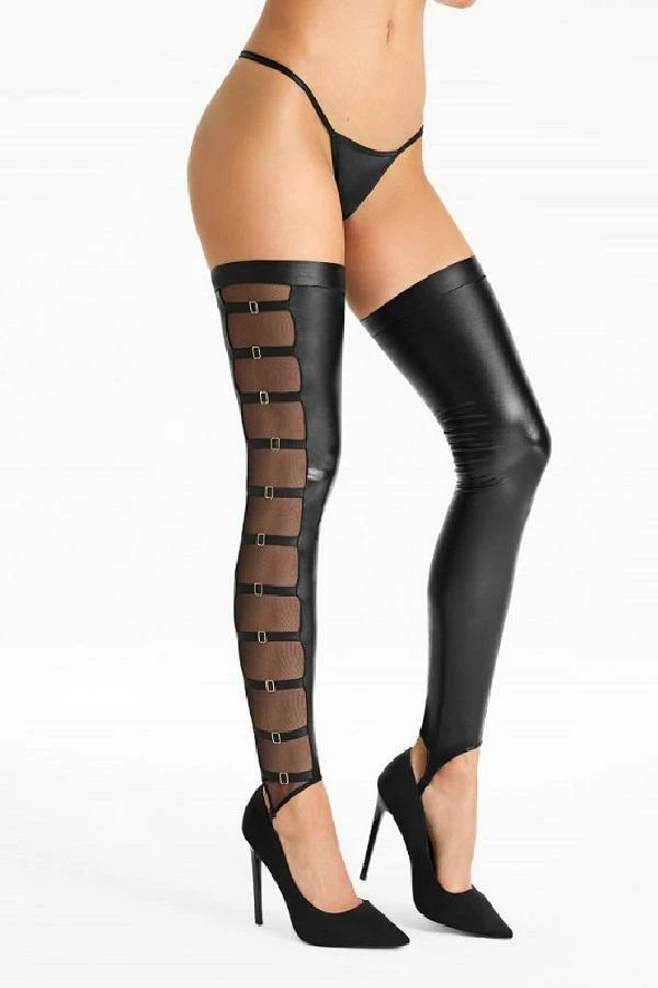 Sophisticated and intricately finished stockings which are a combination of full erotic wet-look with sensual shine and extravagant stripes along the entire length, decorated with golden accessories.
