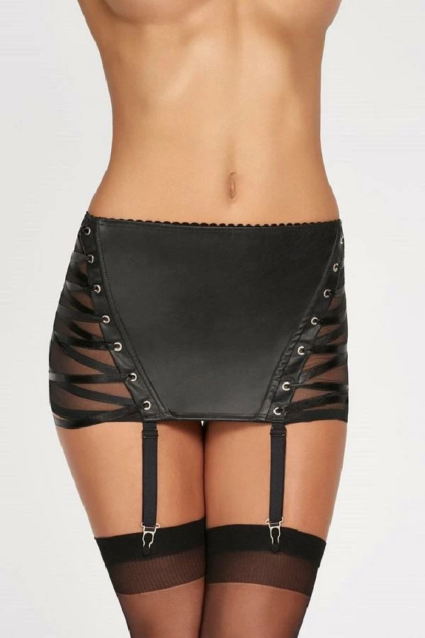 Sexy garter belt made of leather with lacing. Thigh high sheer Stockings are also included. Made in EU.