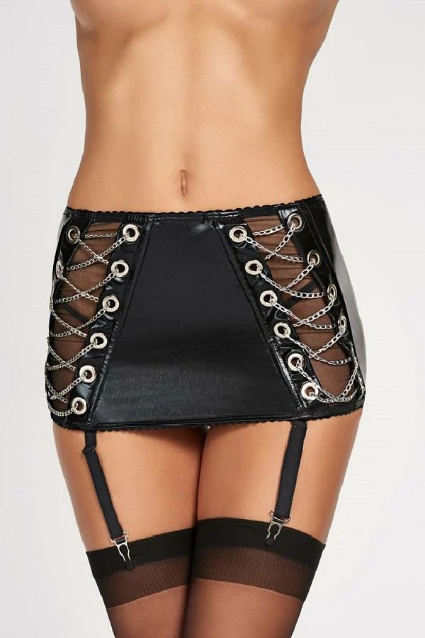 A combination of a shiny wet-look, a transparent tulle and a silver chain. Back fastened with hooks, metal garters. Made in EU.