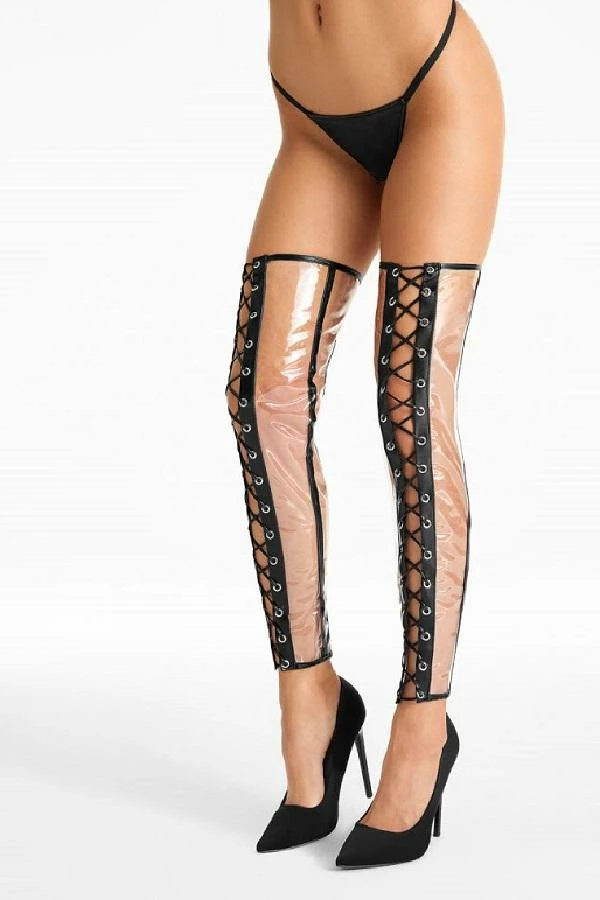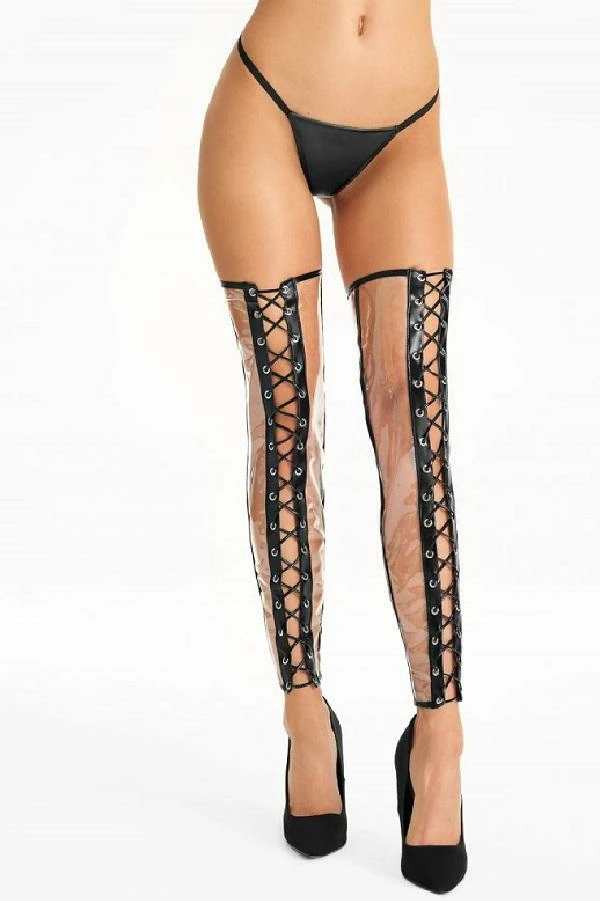 Amazing, unconventional stockings made of transparent foil with black wet-look straps that optically lengthen legs and a with a frivolous full length lacing. Available Sizes: Small/Medium and Large/X-Large.