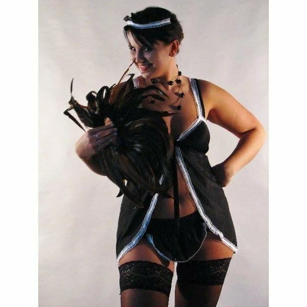 This is a sexy French Maid inspired babydoll nightdress. The set includes a black open front baby doll that is trimmed in white lace and has a black tie ribbon on both sides, a matching black mesh panty with an apron design front and a maid head band.