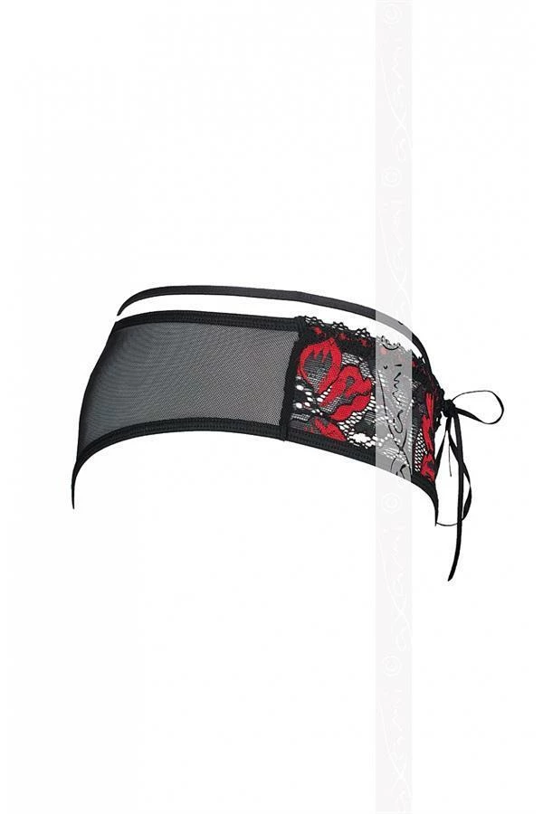 Red, fiery flowers bloom sophisticated embroidery brief panty by Axami. Black lace is featured down front of panty.