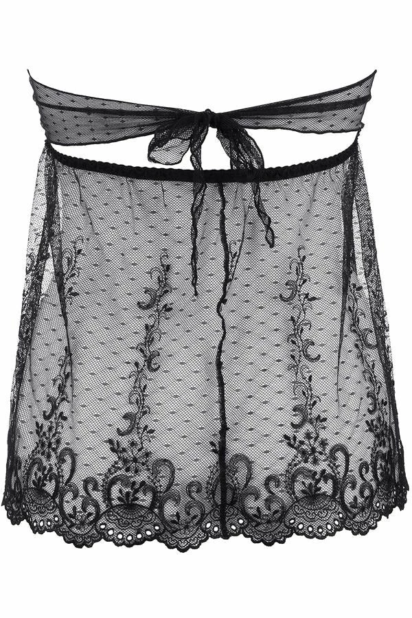 Airy and exotic chemise in a set with a thong, made of the same lace emphasises your energy and catches the most demanding eyes. Comfortable and stable to wear, thanks to the elastic band under the bust line, it will adapt to any figure. The adjustable bow tie on the chest gives an additional advantage of wearing a looser or tight version, as you wish.