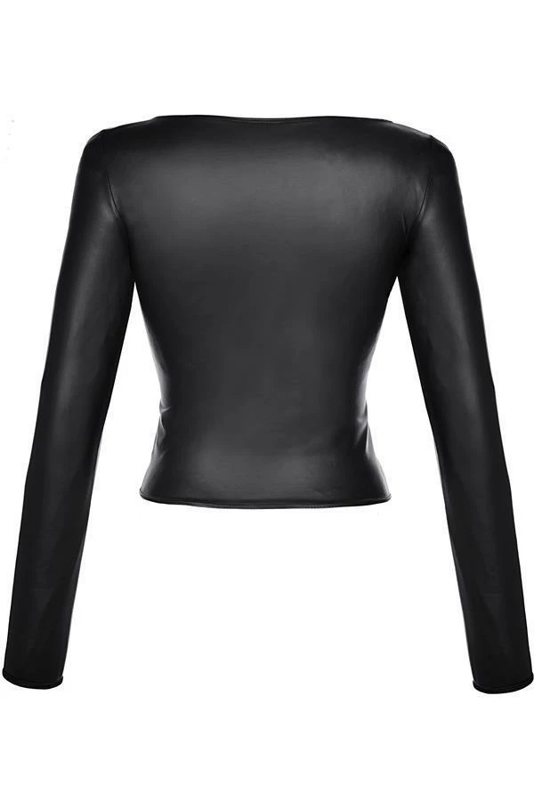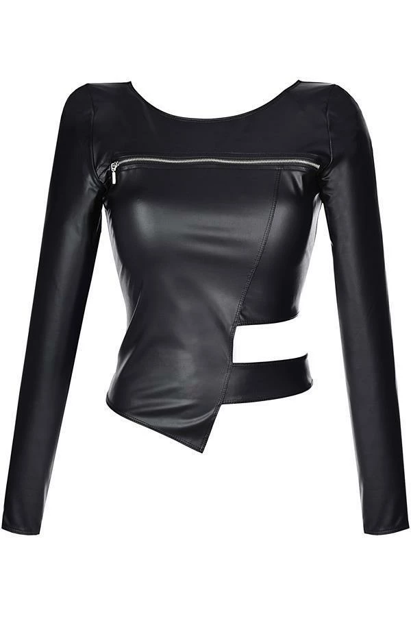 The elegant and fascinating long-sleeve top is an avant-garde design and a novelty in our offer. It has a fancy zip in the front and a non-standard finish in the end. This top can be co-ordinated with the skirt V-9189 also in this collection.