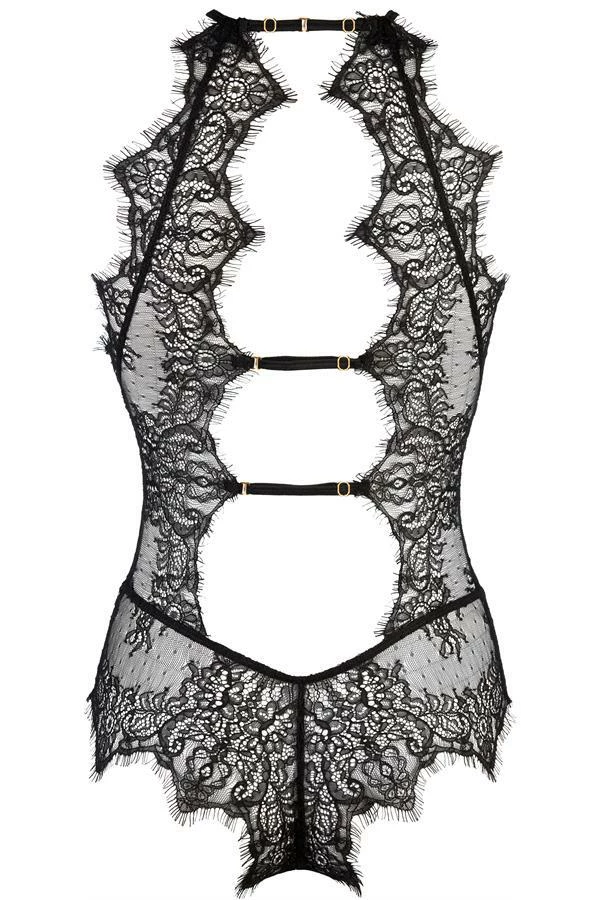 The romantic, black bodysuit V-9490 is a combination of classic black and subtle, intriguing beige cuts. The lace openwork allows to enjoy the look of smooth skin, and the feminine pattern and unusual cuts on the back stress the seductive character of the design. It is fastened on the neck and in the crotch, without wires, with adjustable strips.