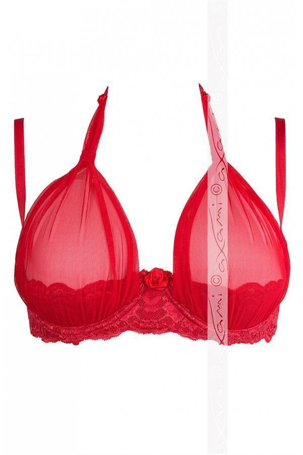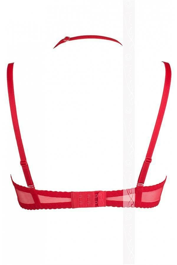 Fancy bra captivates with finesse lace cups covered with red tulle. Feminine, mysterious, sexy – just like you. Fastened with hooks and tied at the neck. This bra can be co-ordinated with G-string V-5858.