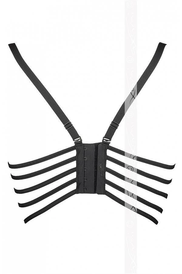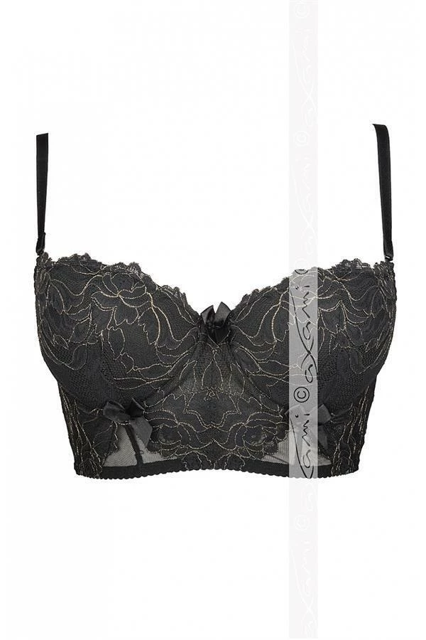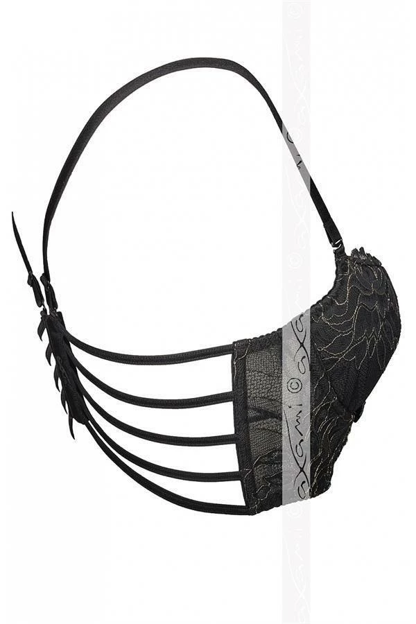 Alluring bra surprises with its semi-corset style and extremely sensual back. Recommended as an addition to any creation with open back. Removable straps and push-up pads will guarantee you a fantastic neckline! Gold embroidery makes this composition elegant and sophisticated. This bra can be co-ordinated with garter belt V-5872, Stockings V-5874 and G-string V-5878.