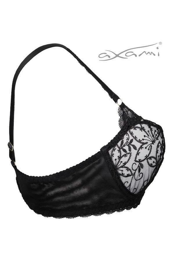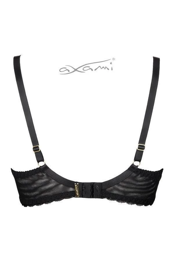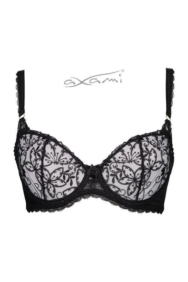 Charming openwork of black lace perfectly presents on your skin. Unique floral embroidery hides tiny but significant at the same time motif a Axami Logo. Soft balconette bra is an exceptional offer that cannot be missed. Special tissues designed and prepared especially for Axami could guarantee individuality and highlight your beauty.