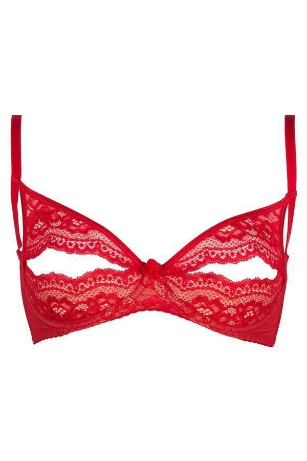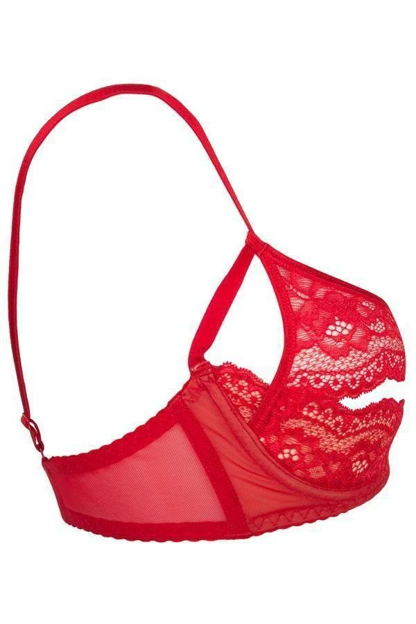 Bra with an intriguing cut, tempting openwork pattern and sensuous cut-outs wont leave anyone indifferent. Red lace highlights the exceptional nature of this model, and your true beauty! In set with garter belt V-6722 and G-string V-6728. Hook and eye fastening and not removable straps. Shown with red fish-net thigh high stockings V-5214 Seduce Me