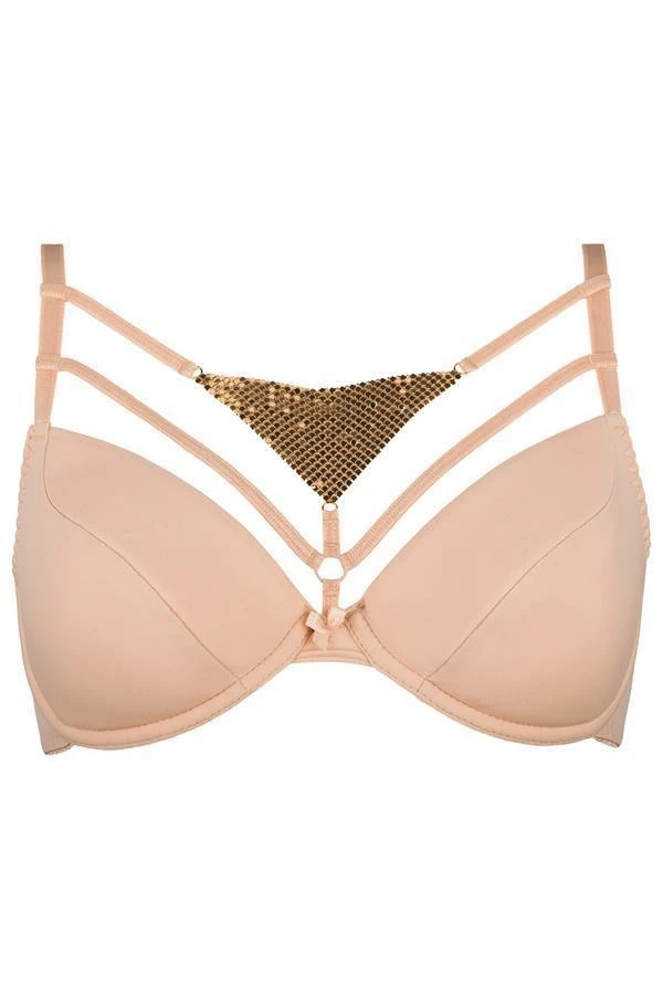 This beige push up bra seduces you with captivating decoration on the neckline – which makes you want to reveal a little bit more . The thin, flexible strips connect the straps and the bra cups – creating an intriguing adornment. Universal and absolutely unique at the same time – model fulfils the dream of lingerie you want and can show! This bra can be co-ordinated with G-string V-7078. The bra has a hook and eye fastening on the back. Adjustable shoulder straps are not removable.