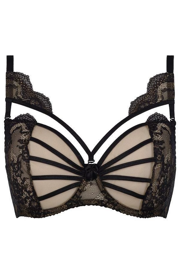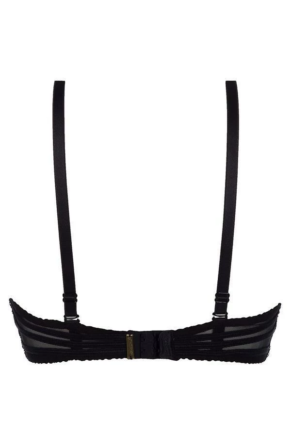 Soft bra is a very original model due to the remarkable combination of black lace with a thin, transparent tulle and ornaments on the neckline. Decorative straps are not removable. It has a hook and eye fastening on the back. This bra can be co-ordinated with G-string V-8088 and stockings V-7894.