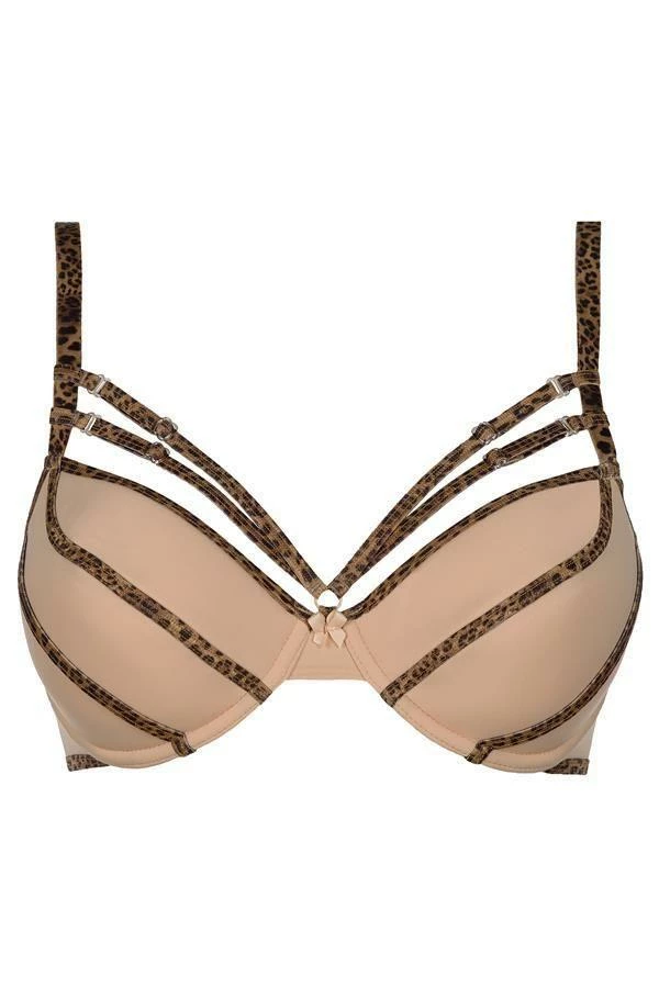 Beige push-up bra seduces you by interesting decoration on the neckline – which will make you want to reveal a bit more … The thin, flexible strips connected with the cups of the bra – create an intriguing adornment. This model is both universal and absolutely unique! It looks fantastic when co-ordinated with briefs V-8163, G-string V-8178 and garters V-8164. This model has a hook and eye fastening on the back, removable pads and adjustable, nor removable straps.