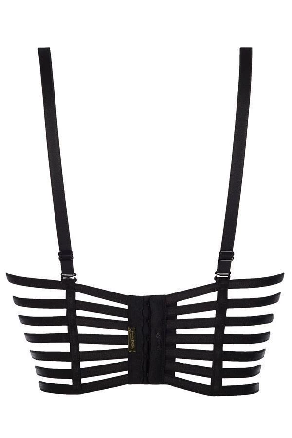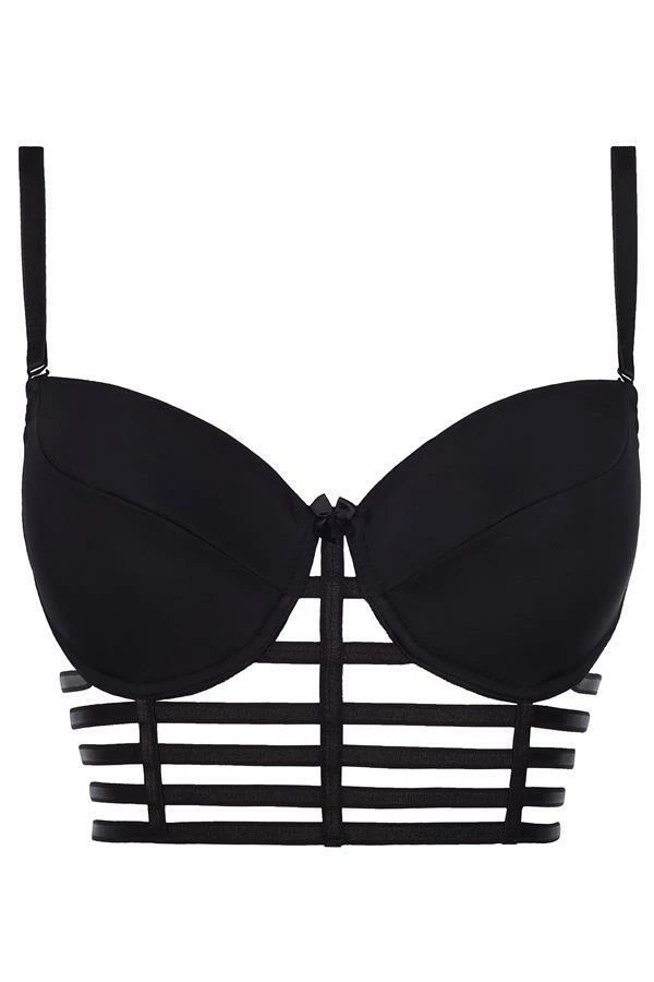 Black push-up bra combines a classic, yet seducing simplicity with interesting cut. Black stripes create an openwork semi-corset. This model is universal and absolutely unique at the same time.
