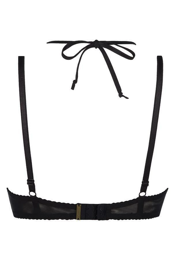 Peek-a-boo bra is an intriguing combination of passionate red and deep black. Flirtatious frills sensually surround the bust, emphasizing its shape and black lace is adorned with beautiful floral ornament. Bra beautifully when co-ordinated with G-string V-8298 and V-7794 stockings. The bra has a hook and eye fastening on the back, and is tied on the neck. The straps are not removable.