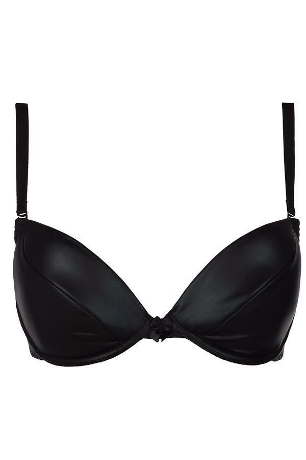 Black, smooth push-up bra is made of a delicate latex with a matte finish. This model is both classic and original at the same time. It looks beautiful solo under any creation or in a set with a gorgeous lace harness V-8346. Removable pads and removable shoulder straps will give you confidence in any situation. This bra can be co-ordinated with Body harness V-8346 and G-string V-8348. Fabric: imitation of latex.
