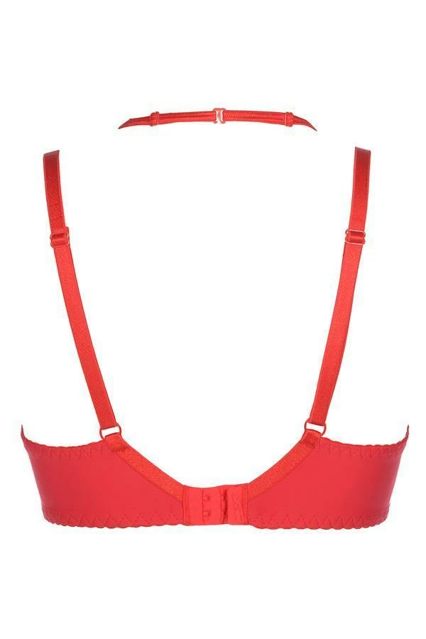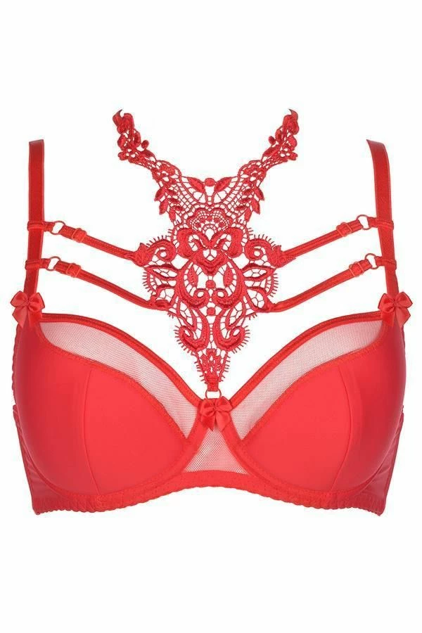 Half padded bra is a very original model due to the unusual combination of red delicate tulle and lace decoration on the neckline. Beautiful red decoration emphasizes the elegance and uniqueness of this model and whole cut. This bra can be co-ordinated with briefs V-8433.
