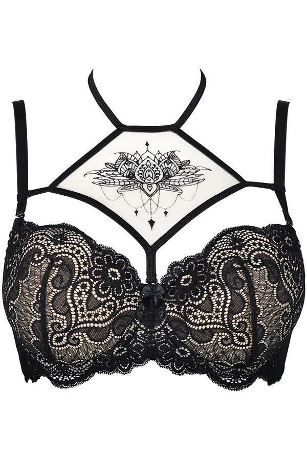 Our unfailing push-up bra will support your bust and push them forward. Above, there is removable flowery filigree, super fashionable this season. Its neck part and straps are adjustable. The bra is as unique as you are, so you must have it. This bra can be co-ordinated with stockings V-7694 and G-String V-9008 Also in this collection.