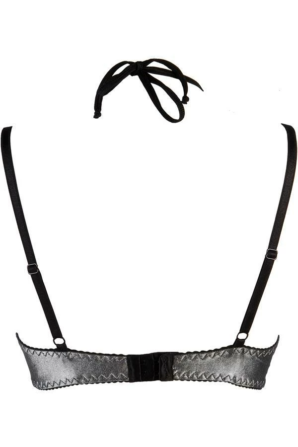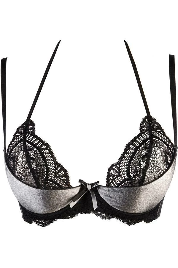 Intriguing bra that surprises viewers with the magnetic, silver gloss of the fabric on the cups. It will be perfect when you need dazzling and unusual underwear. Black and silver bows give it a refined and elegant look. It is tied around the neck and has non-removable straps. Standard adjustment.