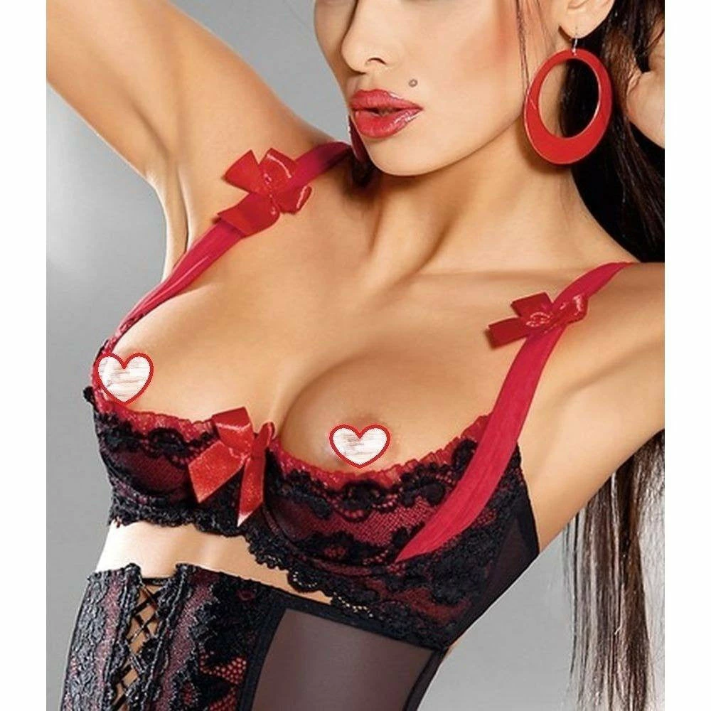 Luxurious and alluring open bra in original design by Axami. Charmed with a sensual, high quality lace, adorned with red satin ribbon bows. Underwire cups will perfectly expose your bust. Elastic, black tulle side wings. Stylish, adjustable, red shoulder straps.