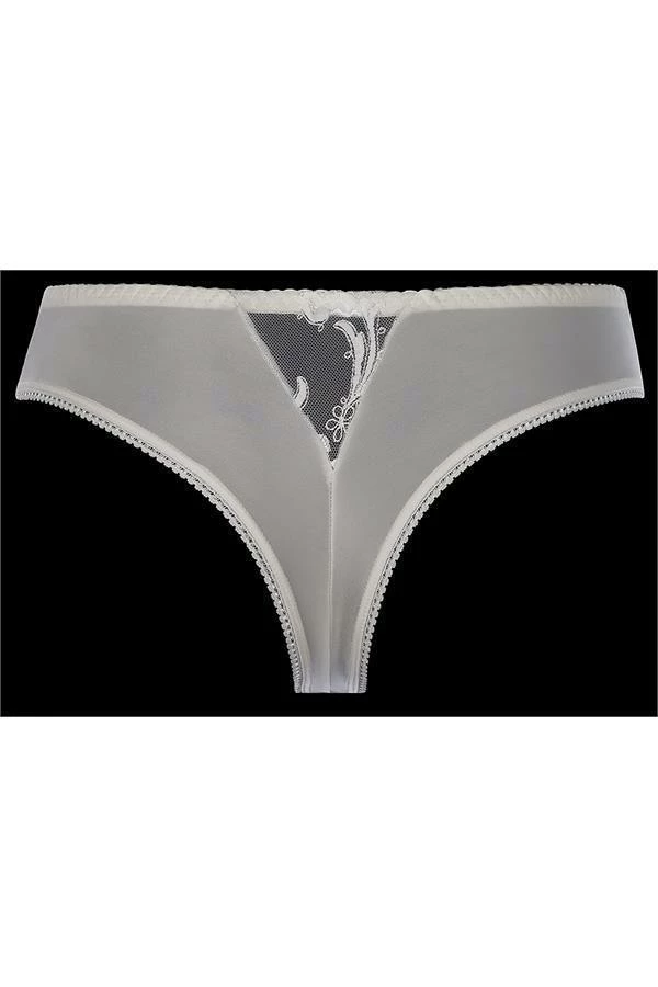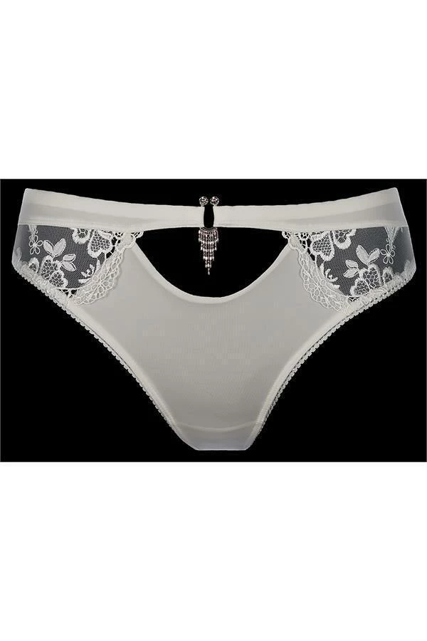 Beautiful, ecru brasiliana G-string seduces with sensual cut, sophisticated combination of fabrics and jewel embellishment.. This model emphasizes the unique nature of the most special moments, by providing you with the perfect look and comfort. This G-String can be co-ordinated with bra Candles V-6831, V-6833 Briefs and V-6814 stockings.