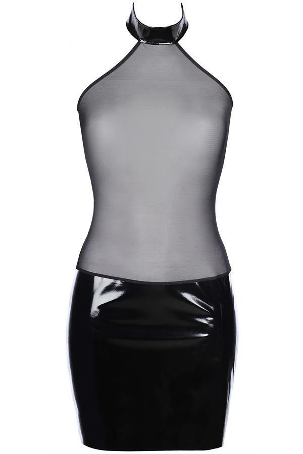 If you want to stand out and feel like the queen of the night, this dress is definitely for you. The classic black dress finished with glossy latex is a must-have of the season. It has a small button fastening in the back of the neck ad is finished with flexible, comfortable tulle.