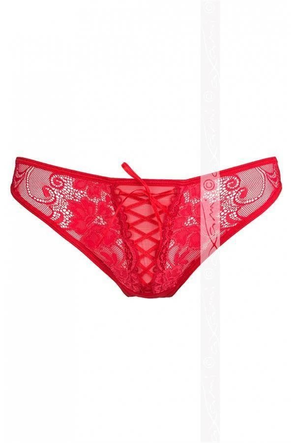 Sexy G-string delight with deep red colour, which emphasize the smoothness of your skin. Feminine lace pattern and intriguing back are prefect compliment for your beauty.. This G-string can be co-ordinated with V-5841 long line bra.