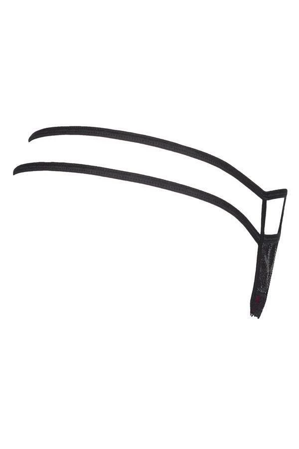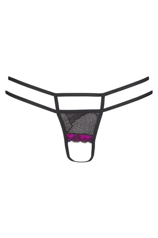 G-String that tempts with sexy cut and original combination of shiny black and intense pink, toying with the sense of sight and provoking further discoveries . This G-string can be co-ordinated with V-6551 bra and V-6552 garter belt.