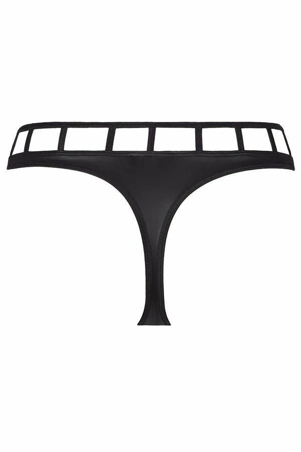 The unique G-string seduces with the original cut and geometric pattern of black tape that will highlight the beauty of your body. Material – matte latex – caresses the skin. This G-String can be co-ordinated with bra V-8391 also in this collection.