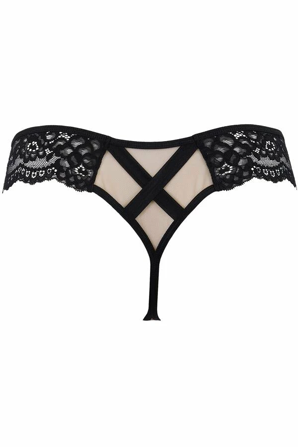 Black and beige thong with interwoven stripes is an extraordinary and fancy accessory embellished with small bows on the sides, also with a fashionable and stylish cross motif on the back. The thong has a comfortable soft and stretchy lace and a cotton gusset to make it a pleasure to wear. This thong can be co-ordinated with bra V-9631 .