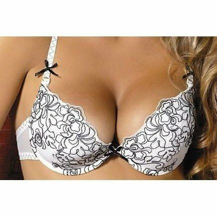 Sensual and elegant push-up bra adorned with black flowery embroideries and black bows and with adjustable shoulder straps.