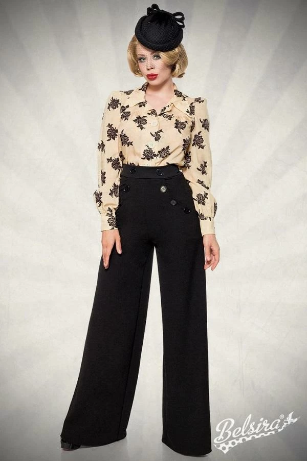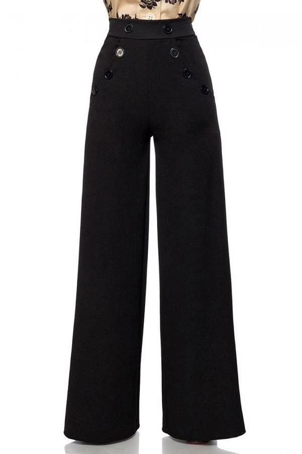 Vintage high waist trousers with flared legs and decorative black buttons at front. There is a fine zipper at side of trousers and inside leg length approximately 86 cm