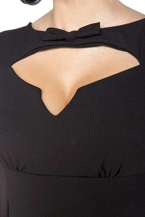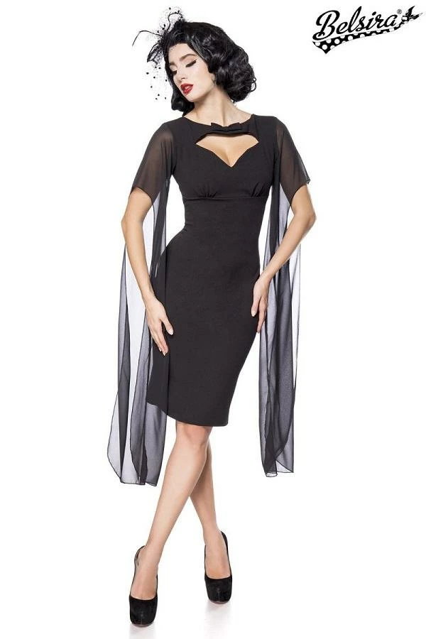 Figure-hugging knee length black dress with sweetheart heart shape cut-out neckline and long transparent sleeves.Â