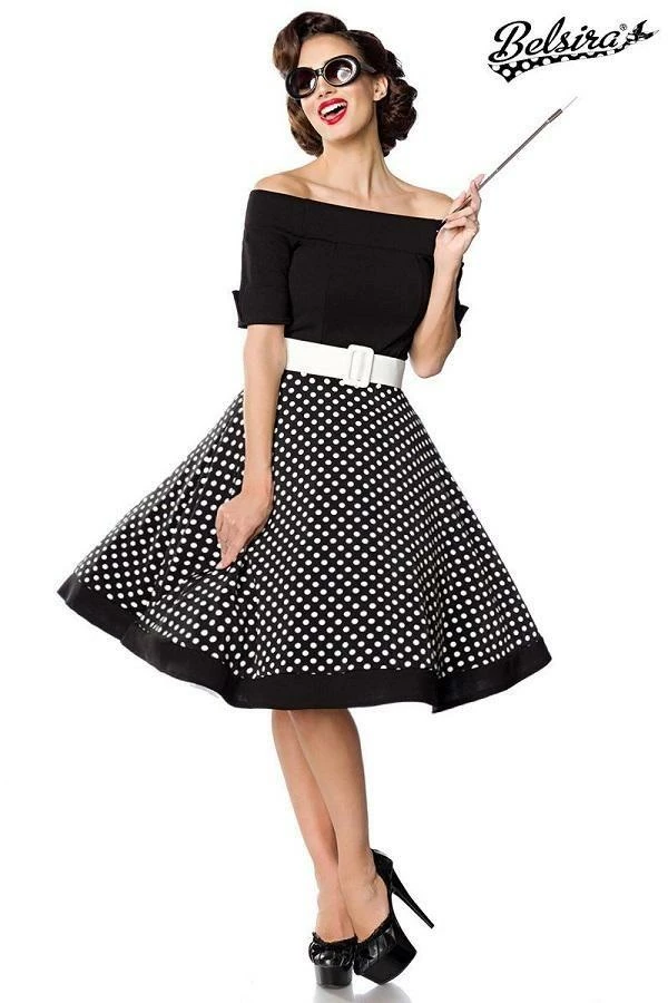 This sexy vintage dress is made of stretchable jersey material with 3/4 length sleeves. The skirt has a nice polka dot pattern. Matching belt is included.
