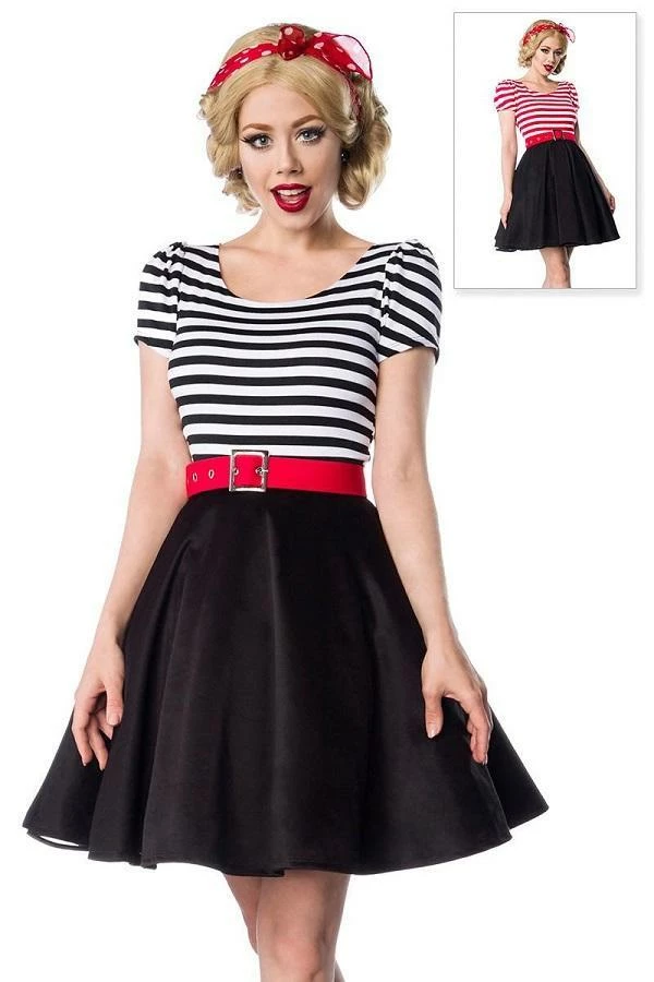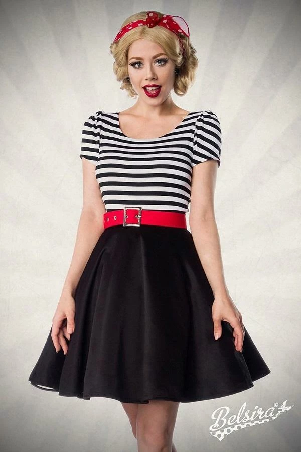This retro swing dress has a wonderful round-neck and short puffed sleeves with striped top.