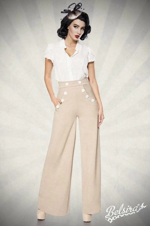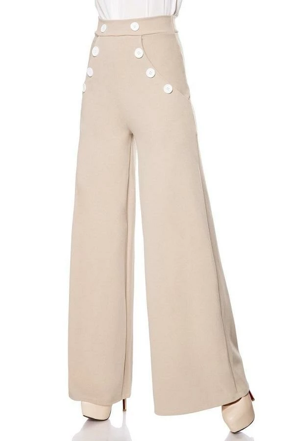 Vintage high waist trousers with flared legs and decorative buttons at front. There is a fine zipper at side of trousers and inside leg length approximately 86 cm