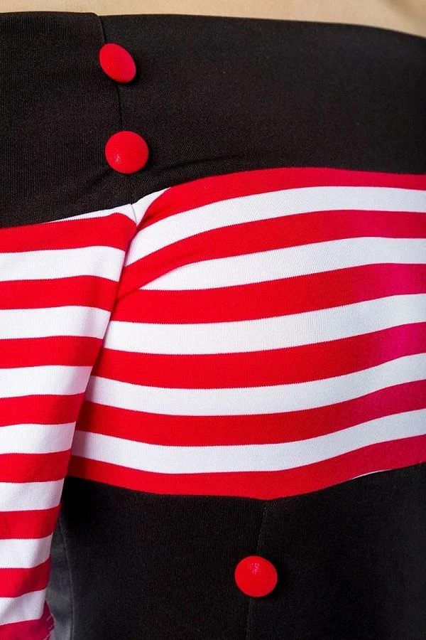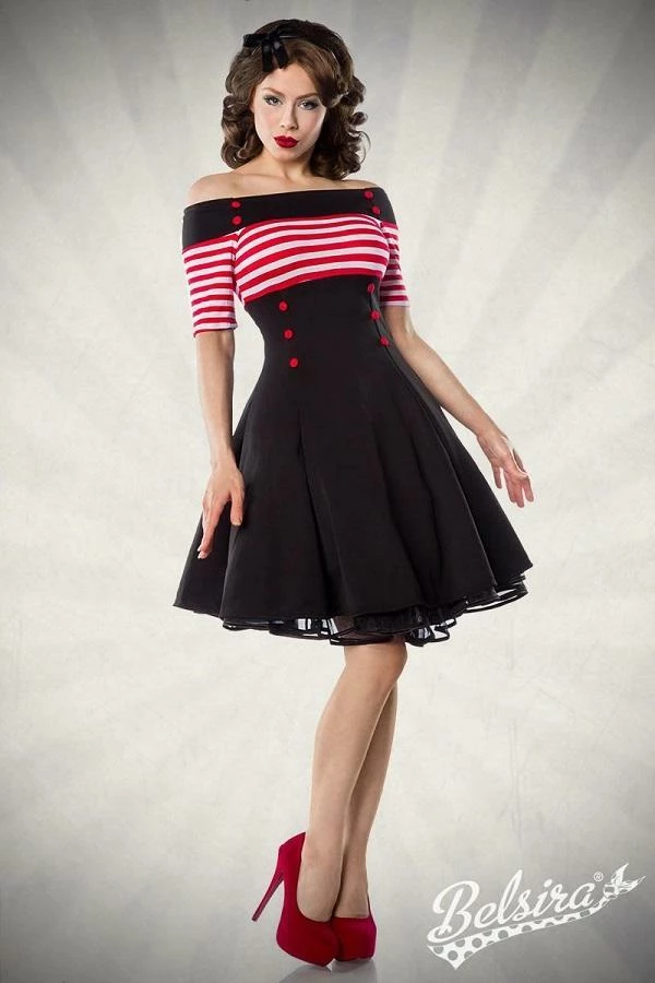 This sexy strapless vintage dress with decorative buttons and short sleeves is made of soft and comfortable material. The top is fitted with elegant lines. Total length in size XS: 83 cm