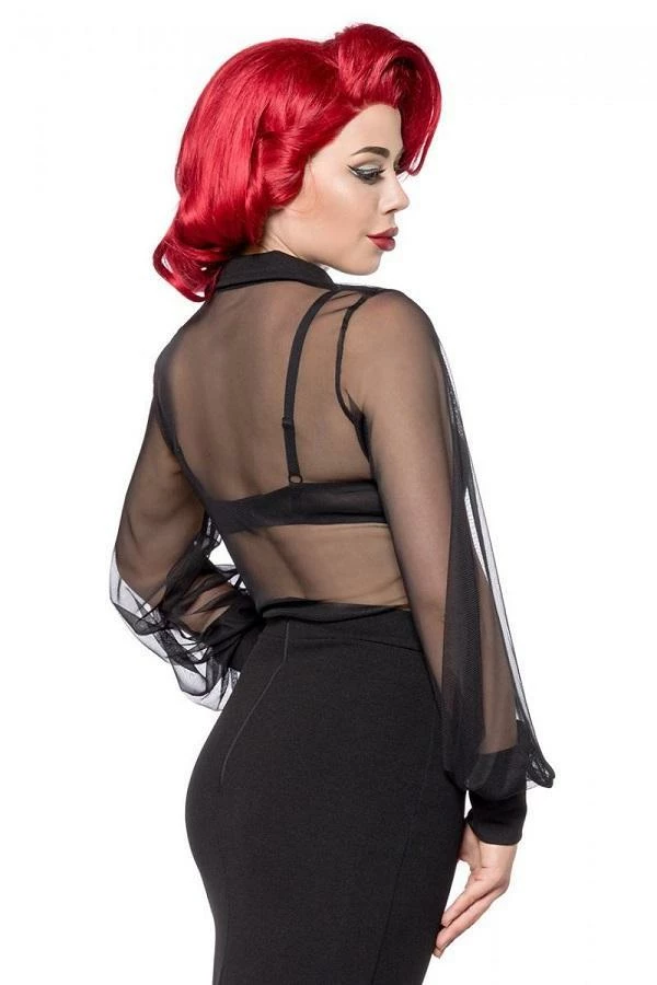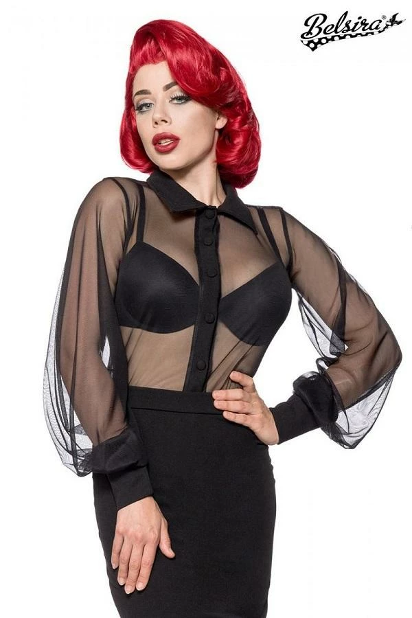 Light mesh long sleeved transparent blouse with a turn down collar and large puff sleeves. Button fastening at the front. Why not view our skirt collection.