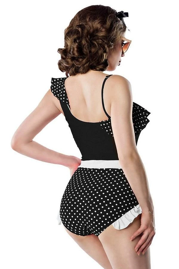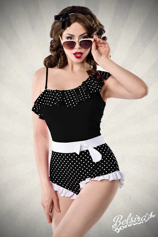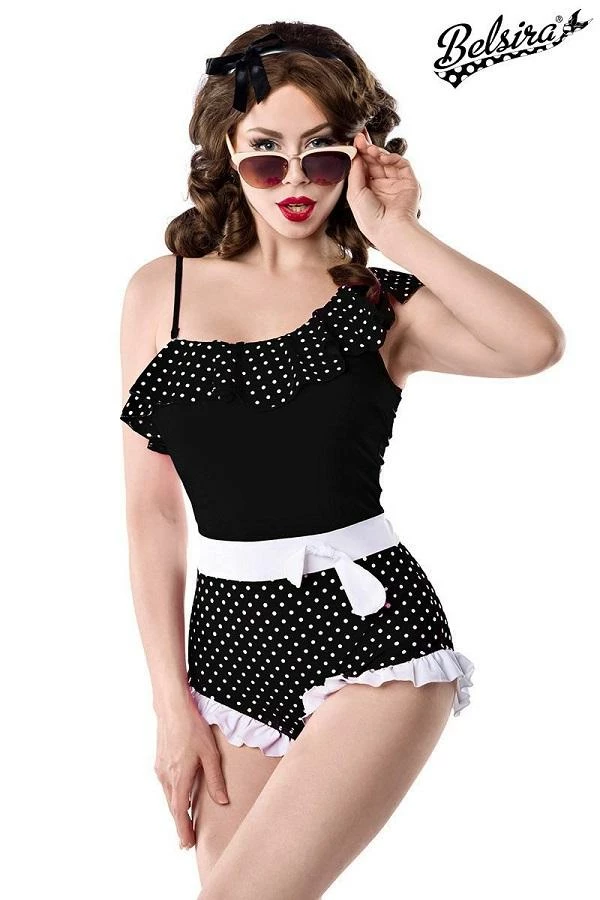 High quality asymmetrical Black and White Vintage swimsuit with Frill from BELSIRA. Contrast inset and ribbon and adjustable straps.