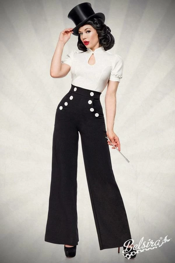 Vintage high waist trousers with flared legs and decorative white buttons at front. There is a fine zipper at side of trousers and inside leg length approximately 86 cm