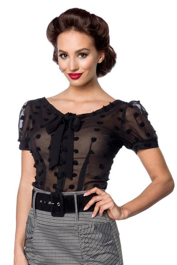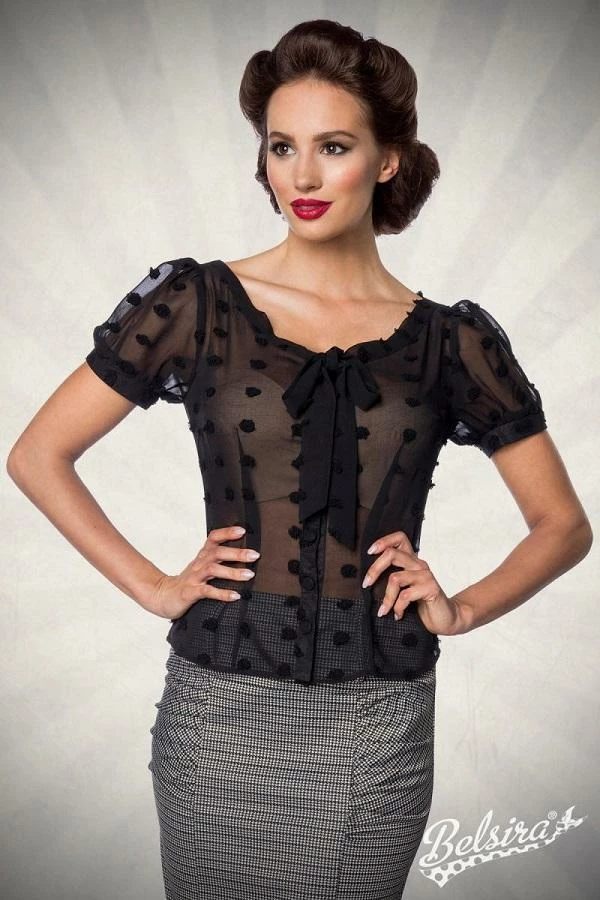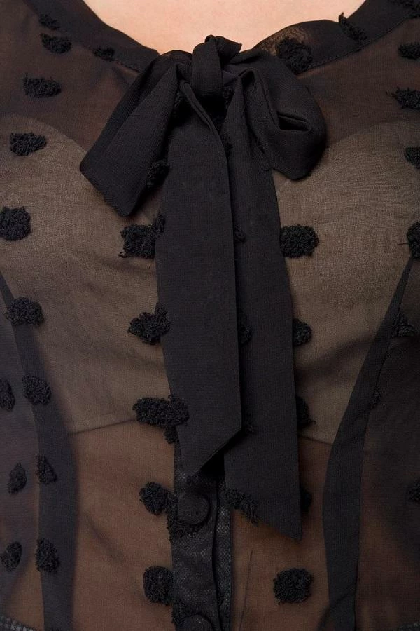 Transparent short sleeved blouse with bow at round neck-line, closes at front with material covered buttons and designed with 3-D dots. This blouse is available in four colours Black, Cream , Blue and Baby Pink