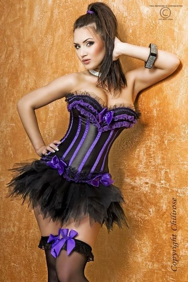Burlesque style corset with a matching panty, by Chilirose lingerie Poland. Surprise your man and welcome him in this sexy corset. Simply the most stunning corset set we have ever set our eyes on! Resplendent in black and imperial purple corset is trimmed with bows and luxurious lace. Skirt and stockings are sold separately!