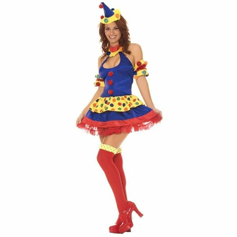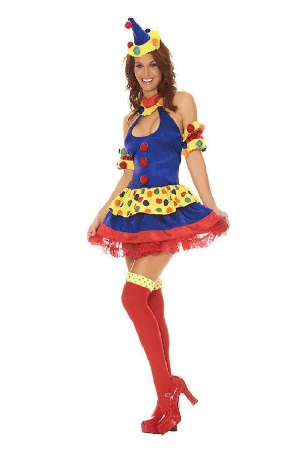 Clown inspired ladies fancy dress costume by Elegant Moments USA. Clowning Around this four-piece costume includes halter dress, arm cuffs, hat and thigh highs.