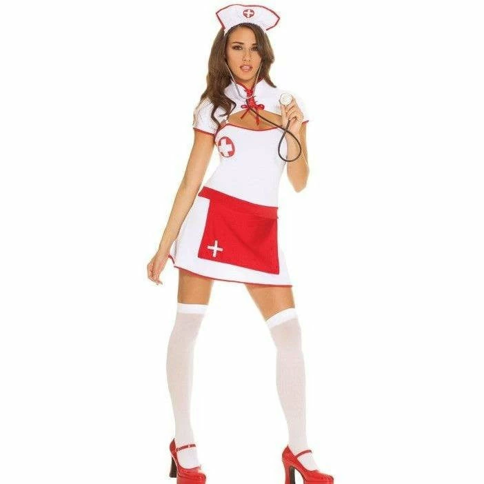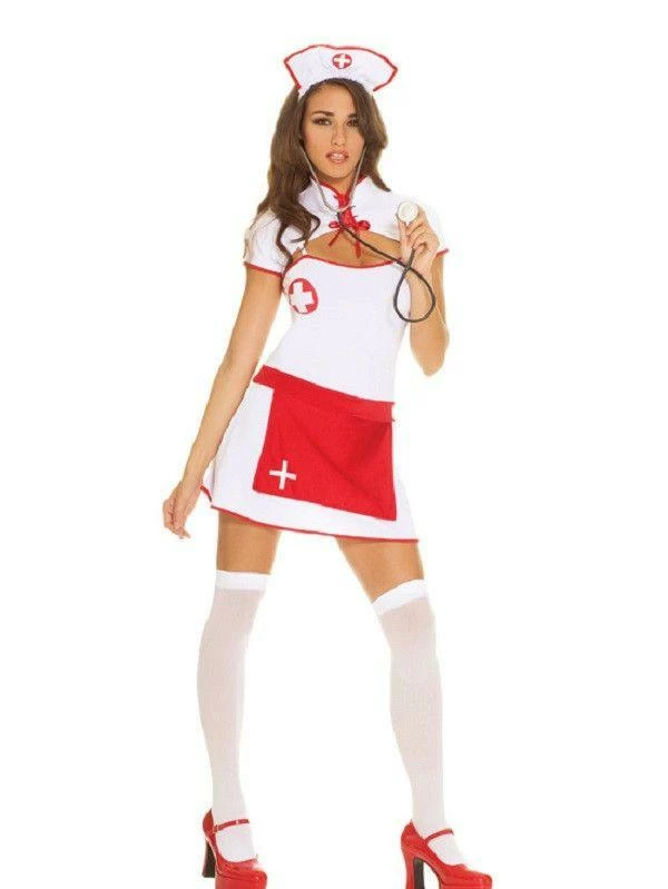 Nurse inspired fancy dress costume. This four-piece nurse costume includes mini dress, with attached apron, lace up shrug, hat and stethoscope.