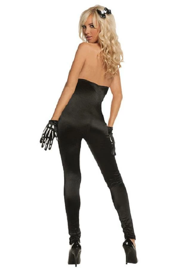 Sexy Glow in the Dark Skeleton fancy dress costume by Elegant Moments USA. Costume includes jumpsuit, gloves and hair pin.
