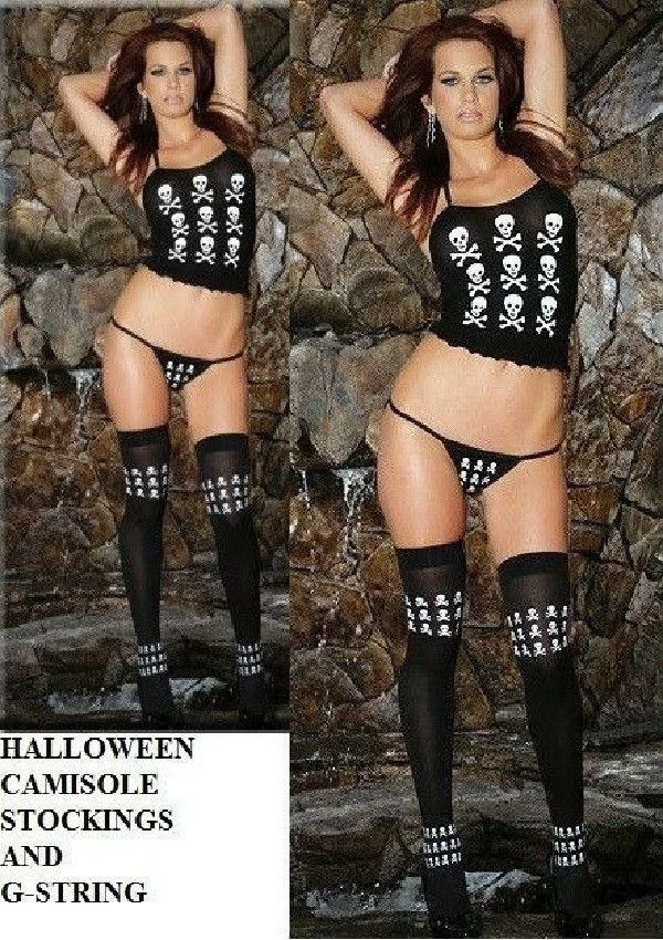 Black opaque camisole top, thong and matching thigh high stockings with skull printing.