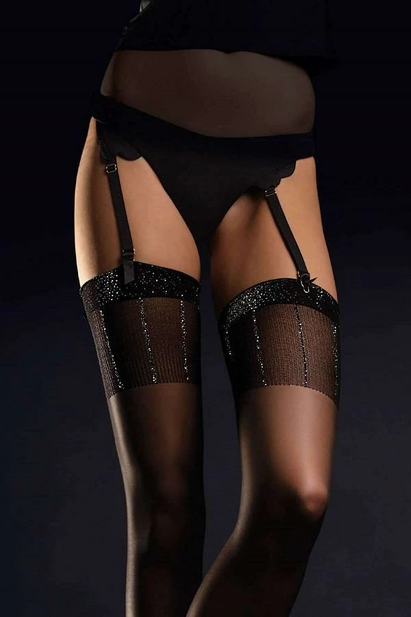 Stunning stockings with a touch of sparkle from Fiore. Be sure to add glamour with these 20 denier sheer stockings with a top filigreed in golden thread and a striking band.(The tassel on the ankle is part of the shoe not the stocking).