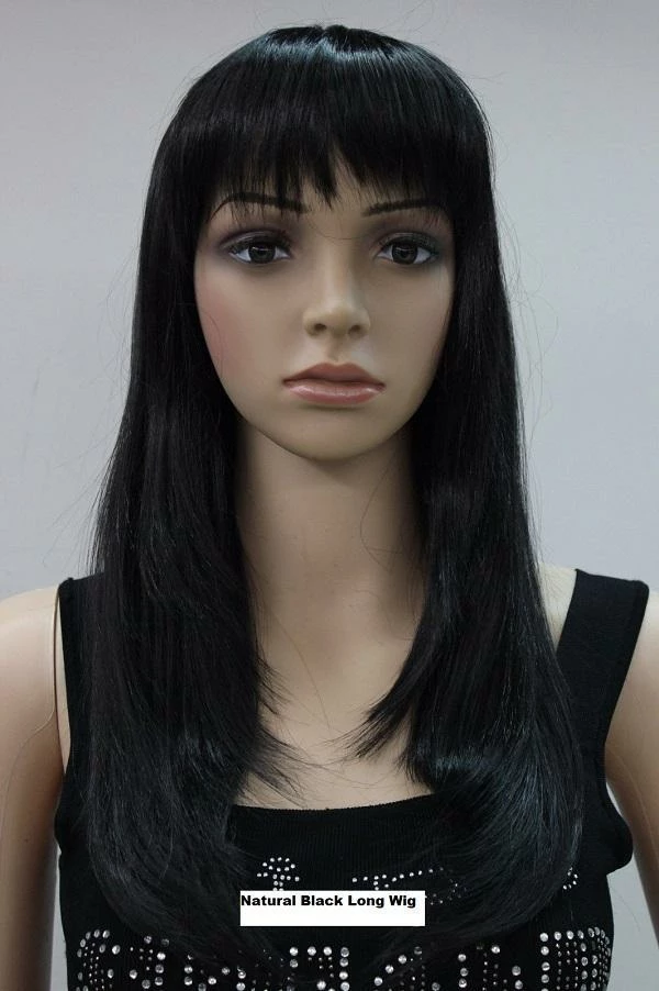 Long straight synthetic daily wear wig. Made from natural high quality fibre. Looks like real hair, synthetic hair type. This synthetic wig has a classic cap construction. One Size, Average, Adjustable strips attached. Wig features a gentle fringe and is slightly layered at the sides