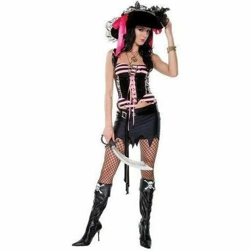 Halloween pirate inspired fancy dress costume by Forplay of Hollywood USA costumes. Who wants to be the First Mate when you can be the Captain’s Pet!? This seaworthy outfit with a buckled trim top, pretty pink vest, jagged edge skirt, sash belt with sword and skull boot covers is the look of pirate’s paradise!